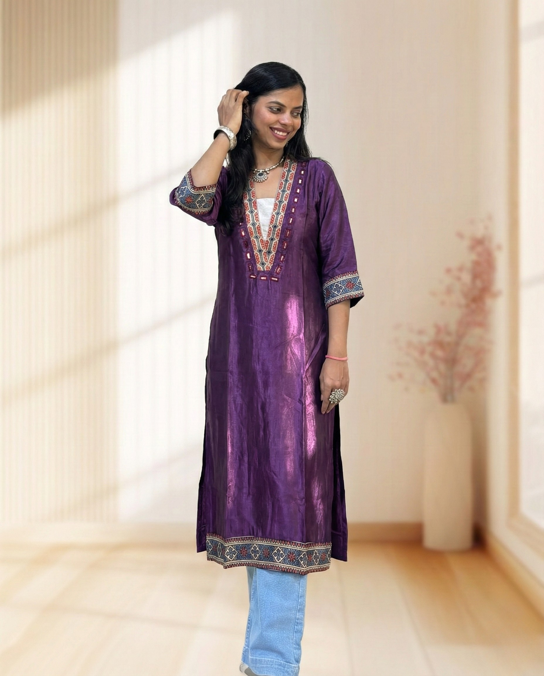 | Description | Vegetable dyed Pure Mashru Silk Straight Ajrakh long kurti in V-neck with Real Mirror Hand Embroidery on Front and sleeves |