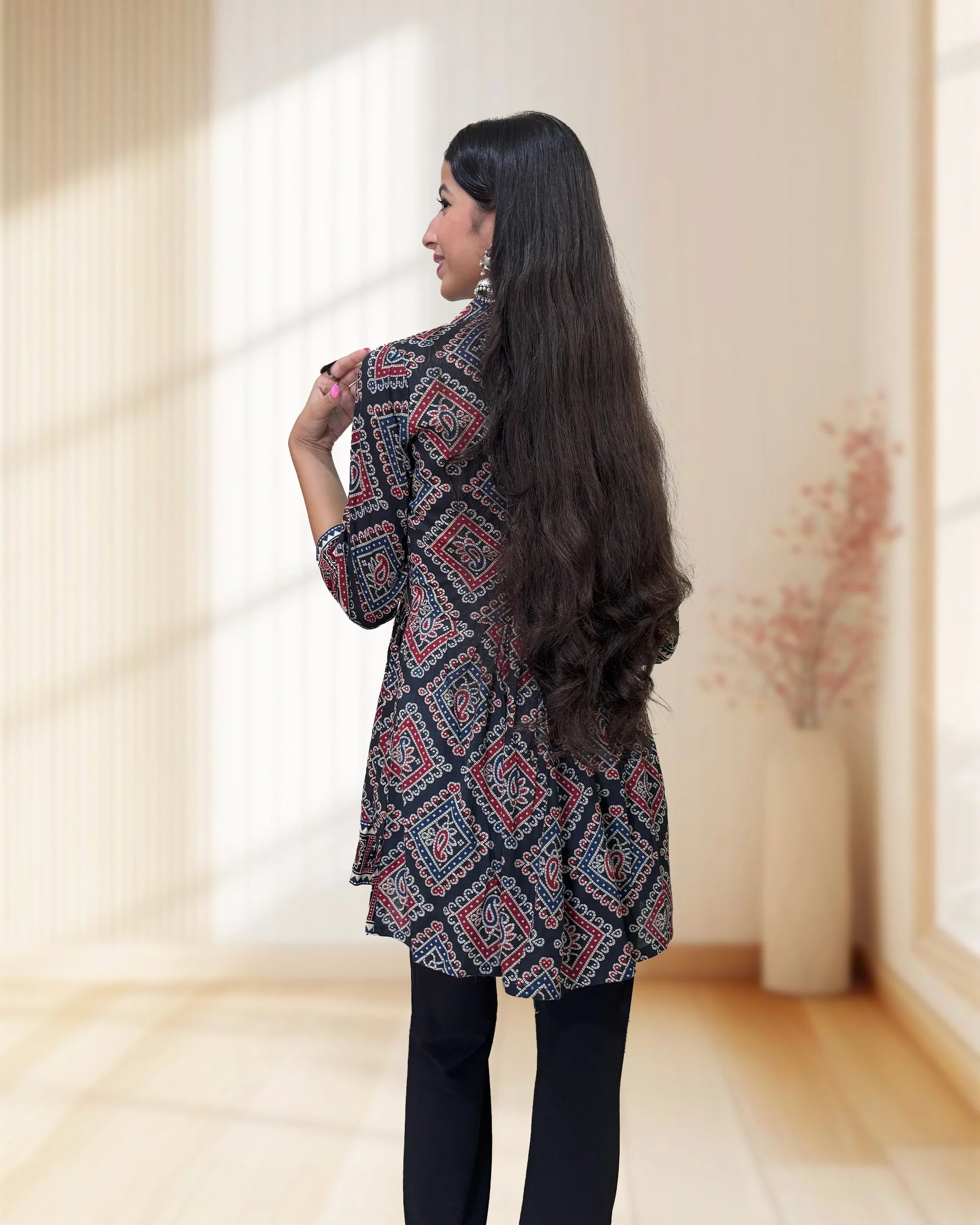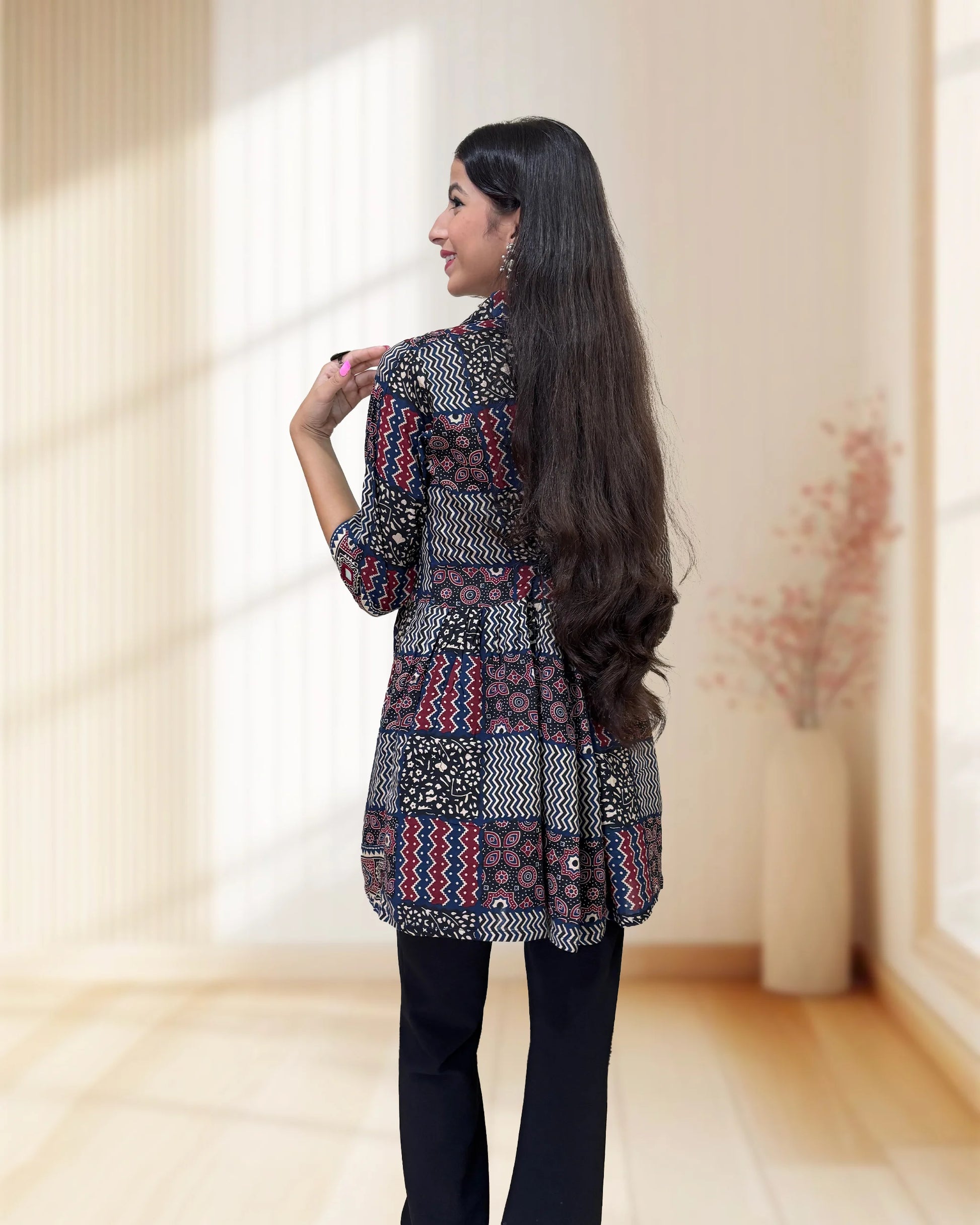 | Description | Vegetable dyed Premium Ajrakh Cotton Short Kurti in beautiful Ajrakh print with Real Mirror Hand embroidery on front and sleeves |