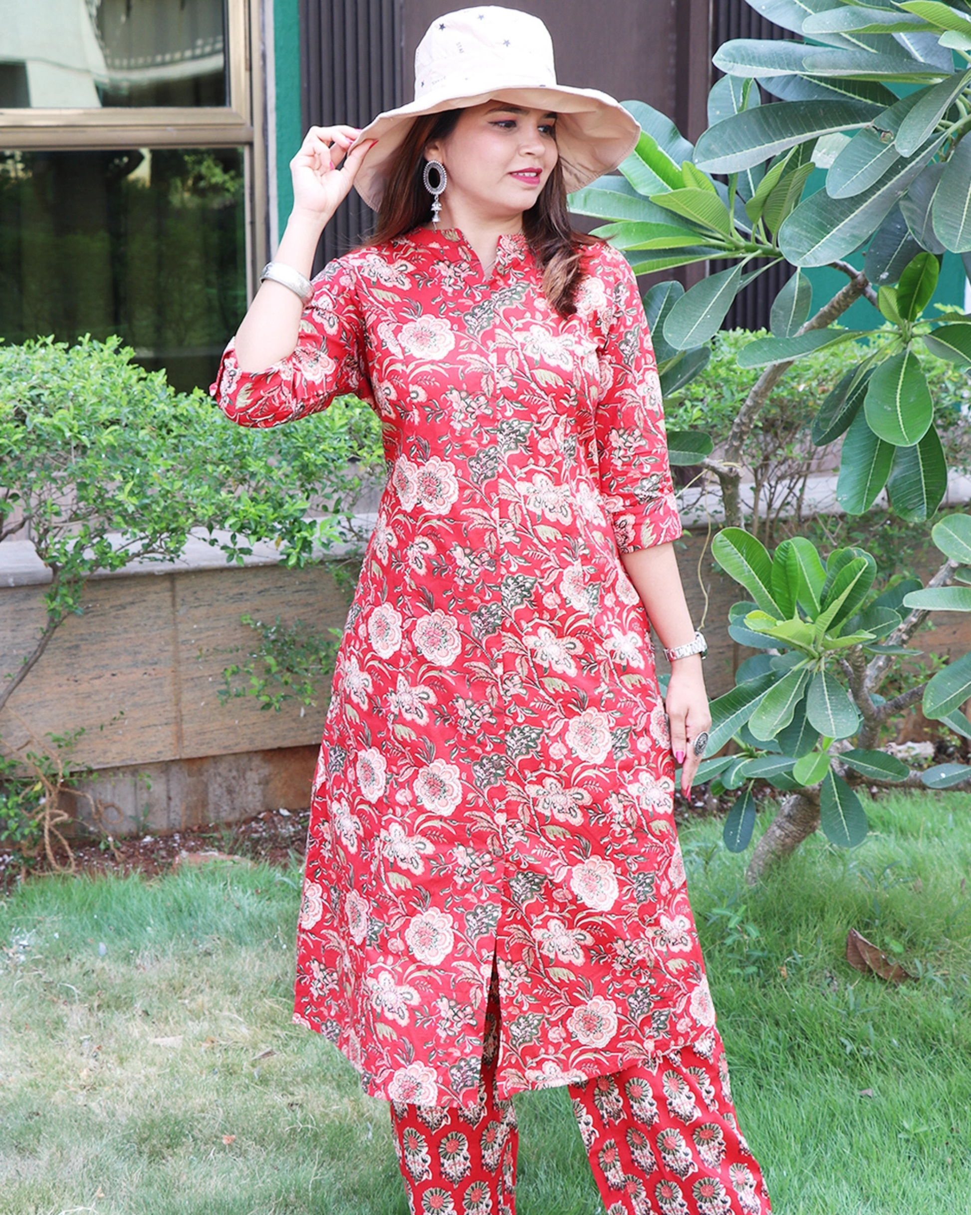 | Description | Red cotton kurti with beautiful floral printed bottom |