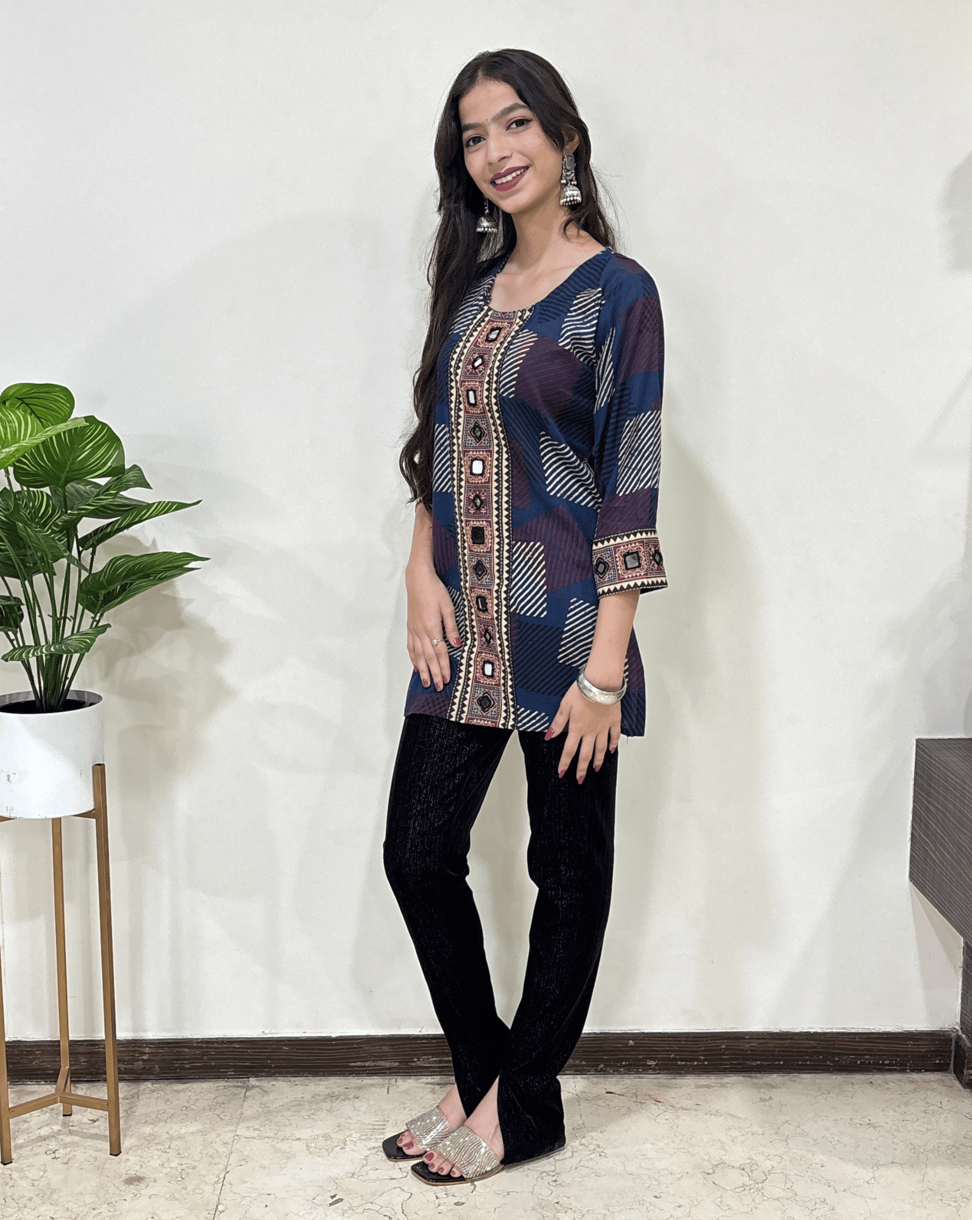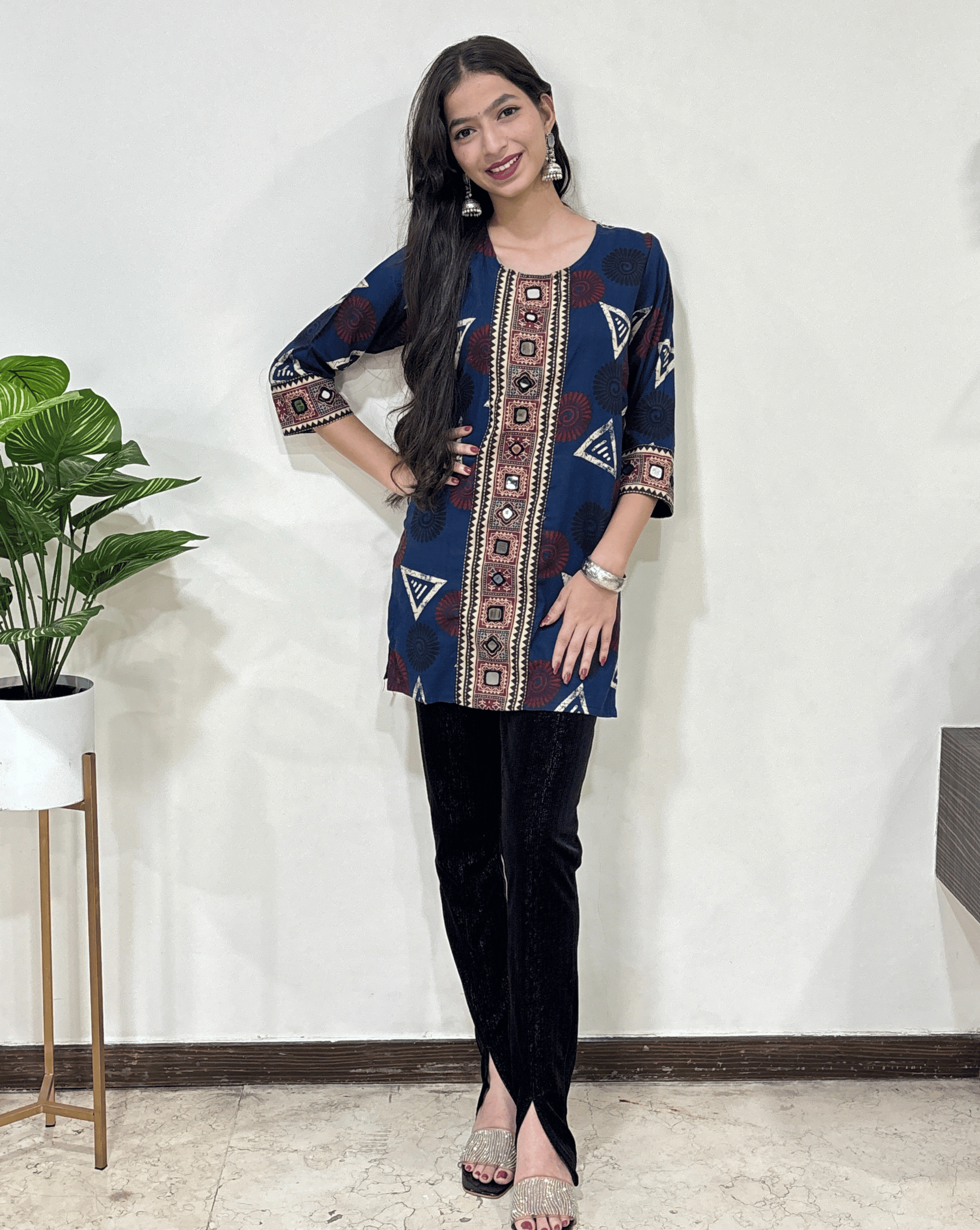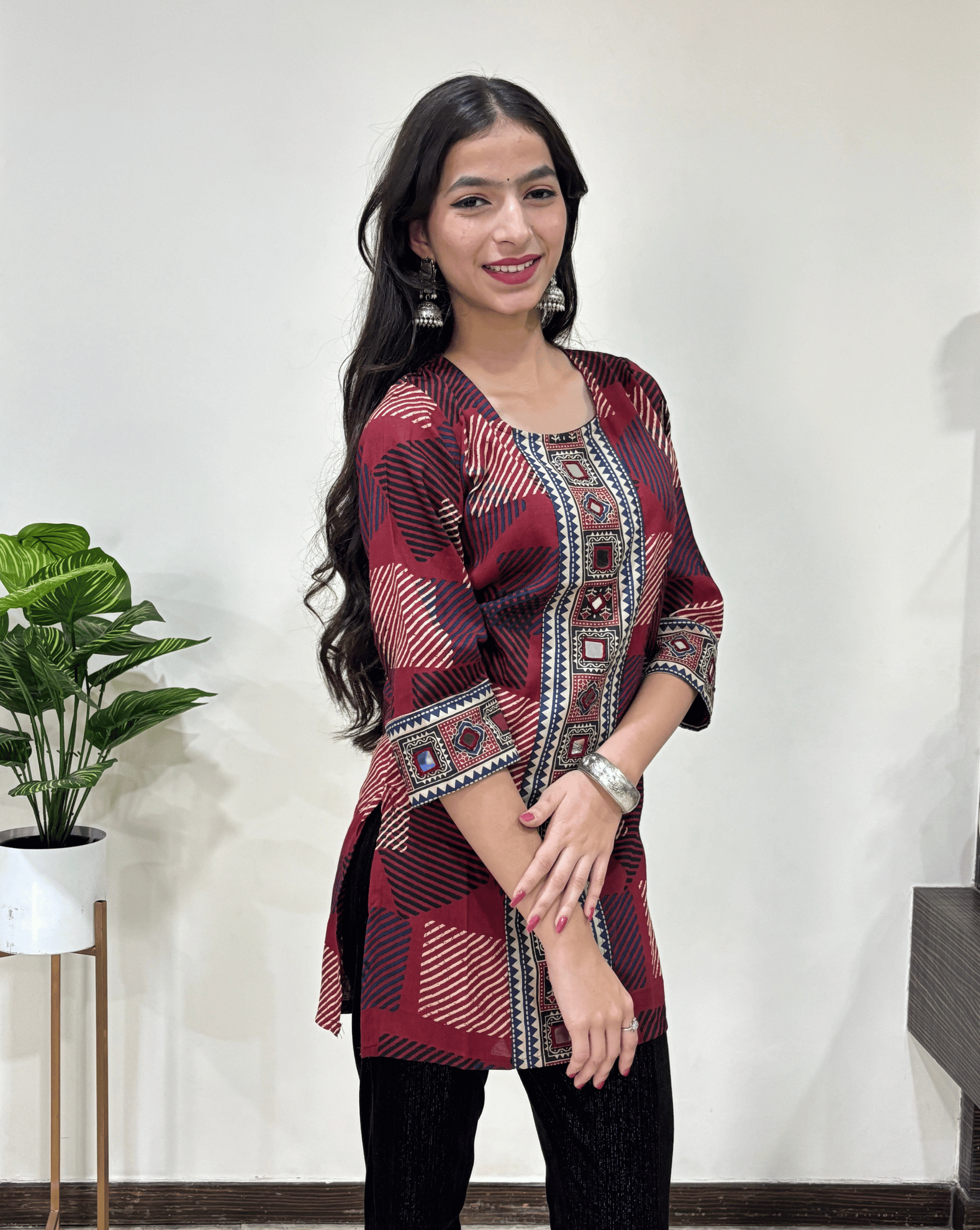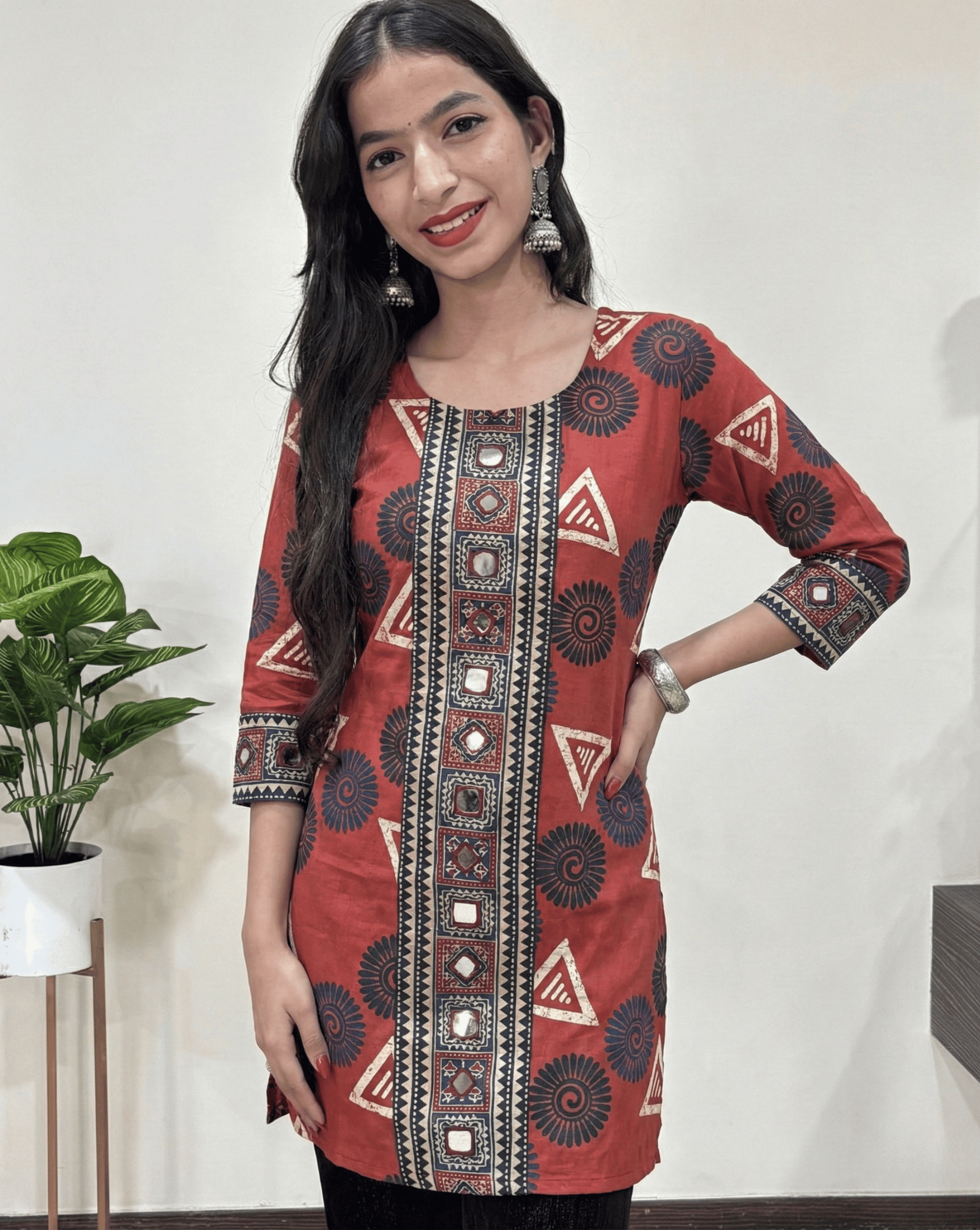 | Description | Vegetable dyed Premium Ajrakh Cotton Short Kurti in beautiful Ajrakh print with Real Mirror Hand embroidery on front and sleeves |