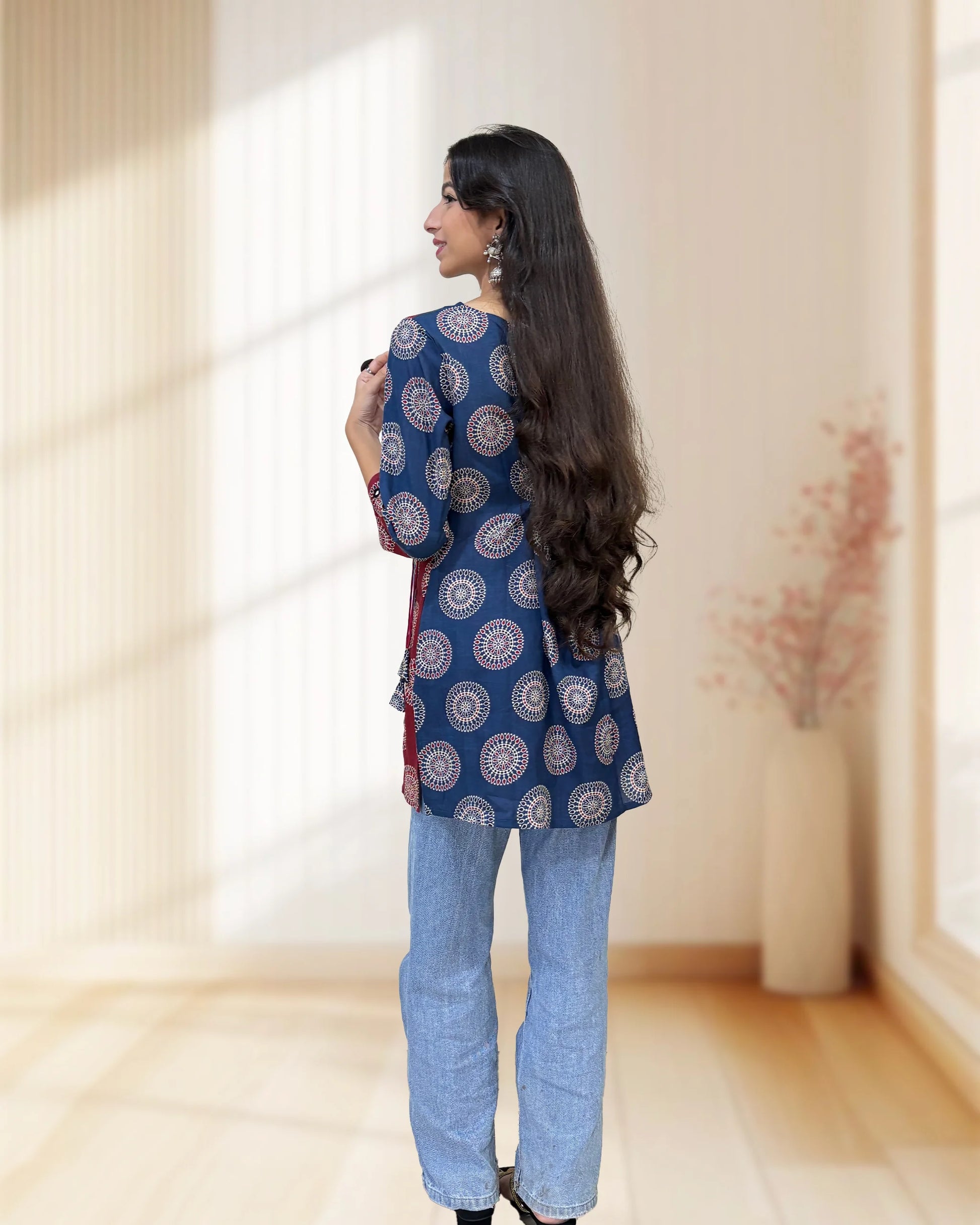| Description | Vegetable dyed Premium Ajrakh Cotton Short Kurti in beautiful Ajrakh print with Real Mirror Hand embroidery on front and sleeves |