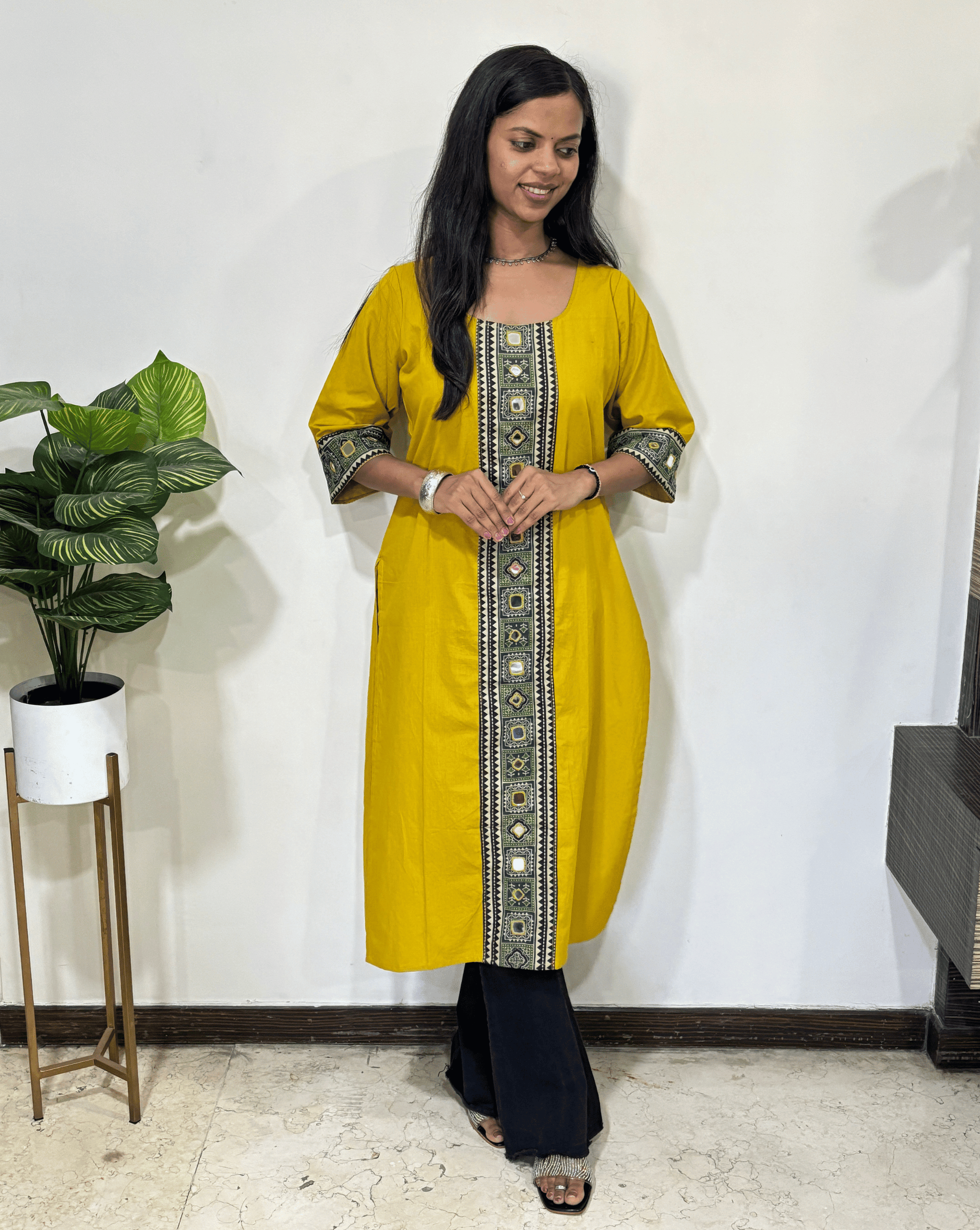 | Description | Premium Vegetable Dyed Ajrakh Dabu Cotton Long Kurti in beautiful Ajrakh Border with Hand Mirror Work On front and Sleeves |