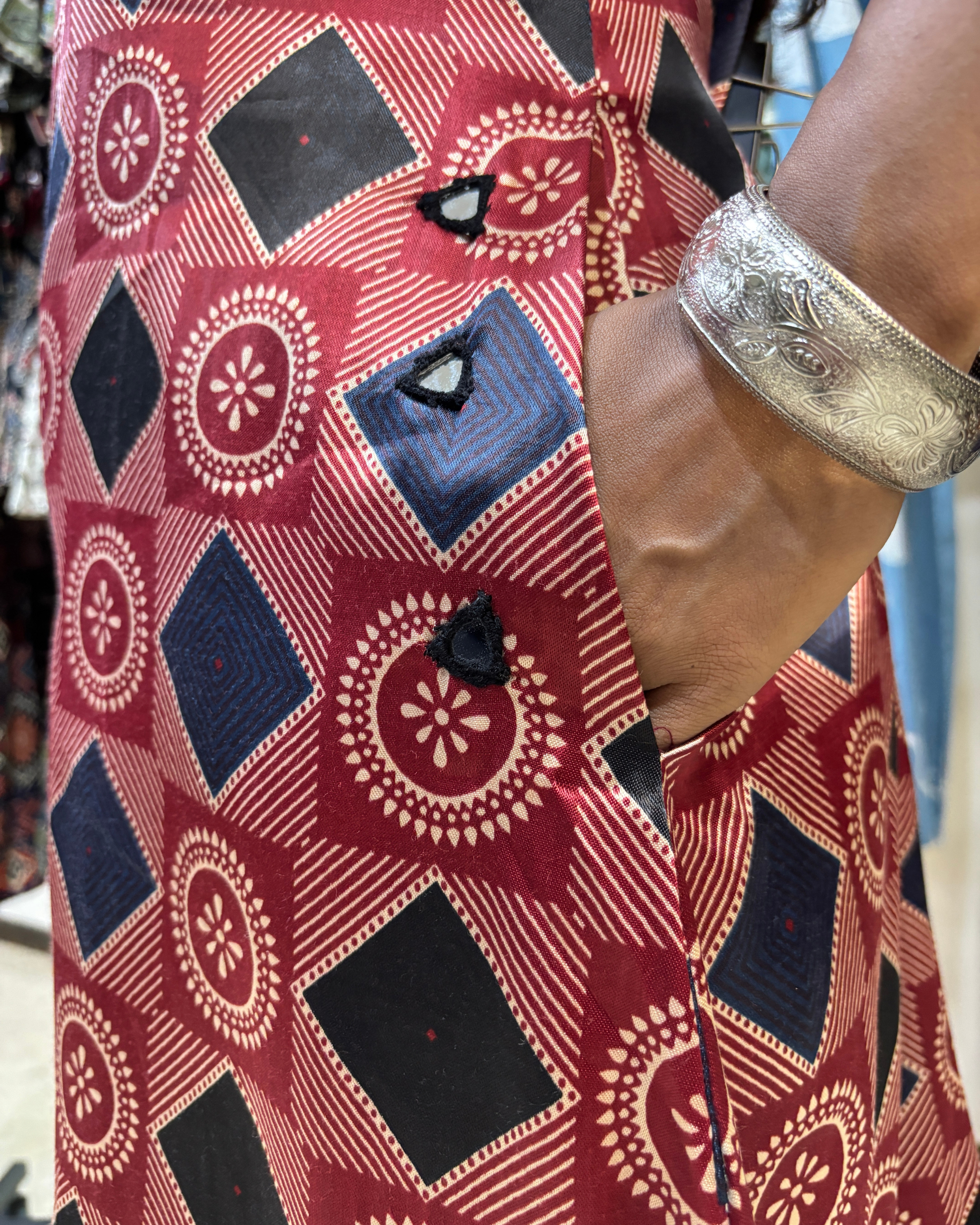 | Description | Pure Mashru Silk kurti in beautiful Natural Ajrakh prints with Hand Mirror Work |