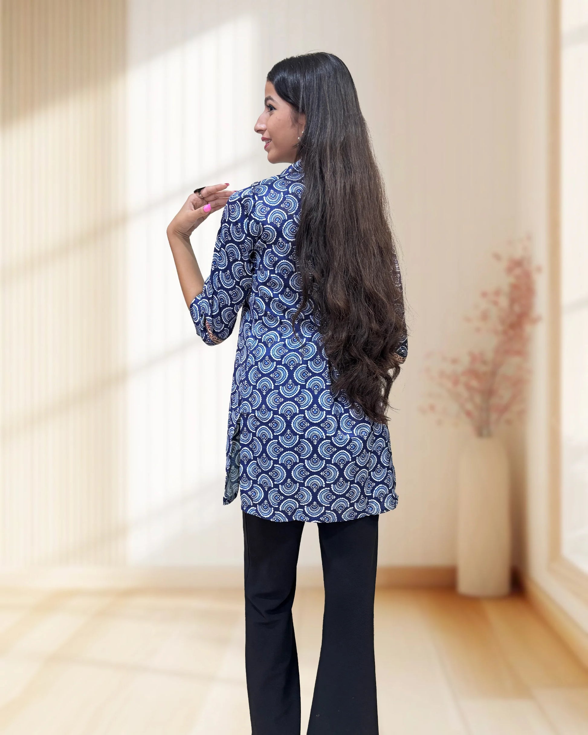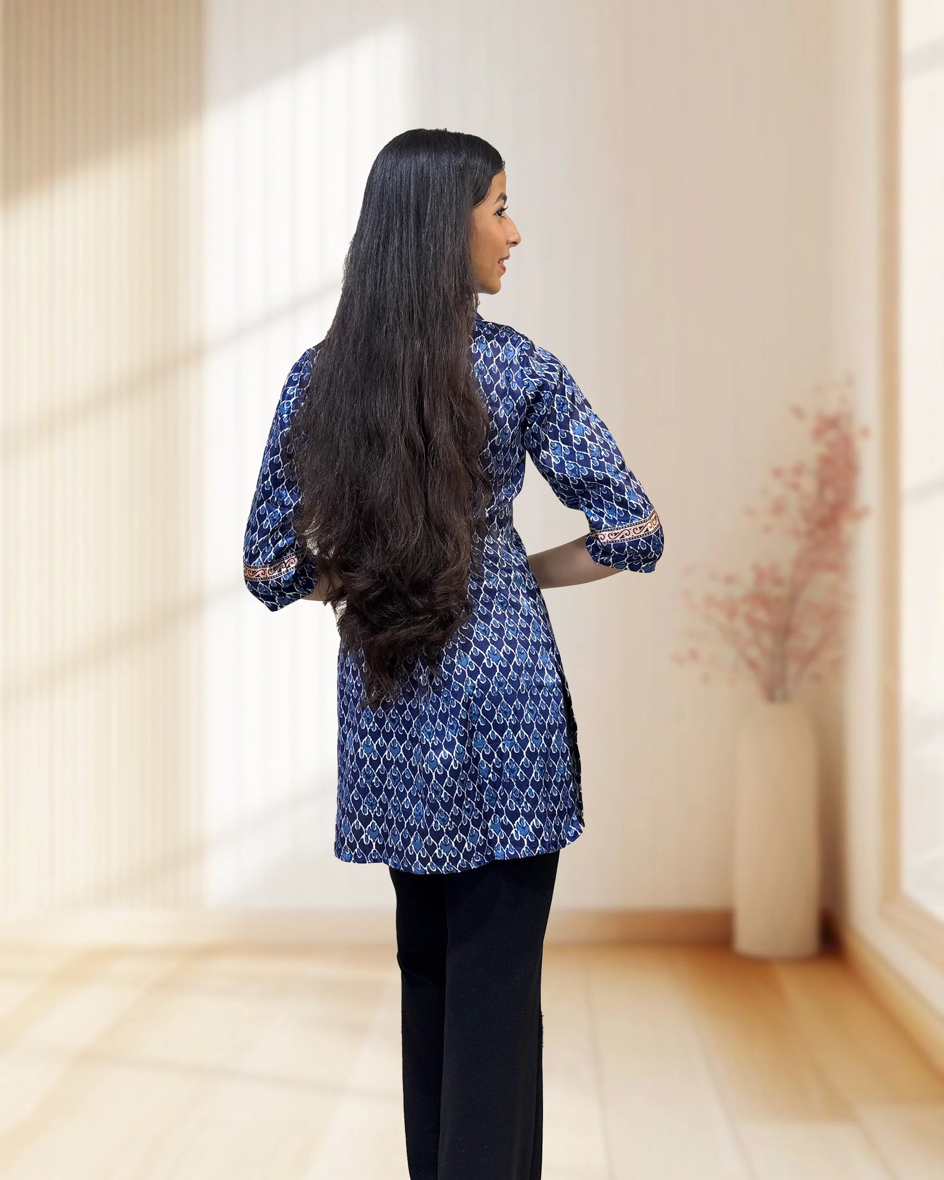 | Description | Vegetable dyed Pure Mashru Silk Straight Ajrakh short kurti in collar-neck with Real Mirror Hand Embroidery on Front and sleeves |